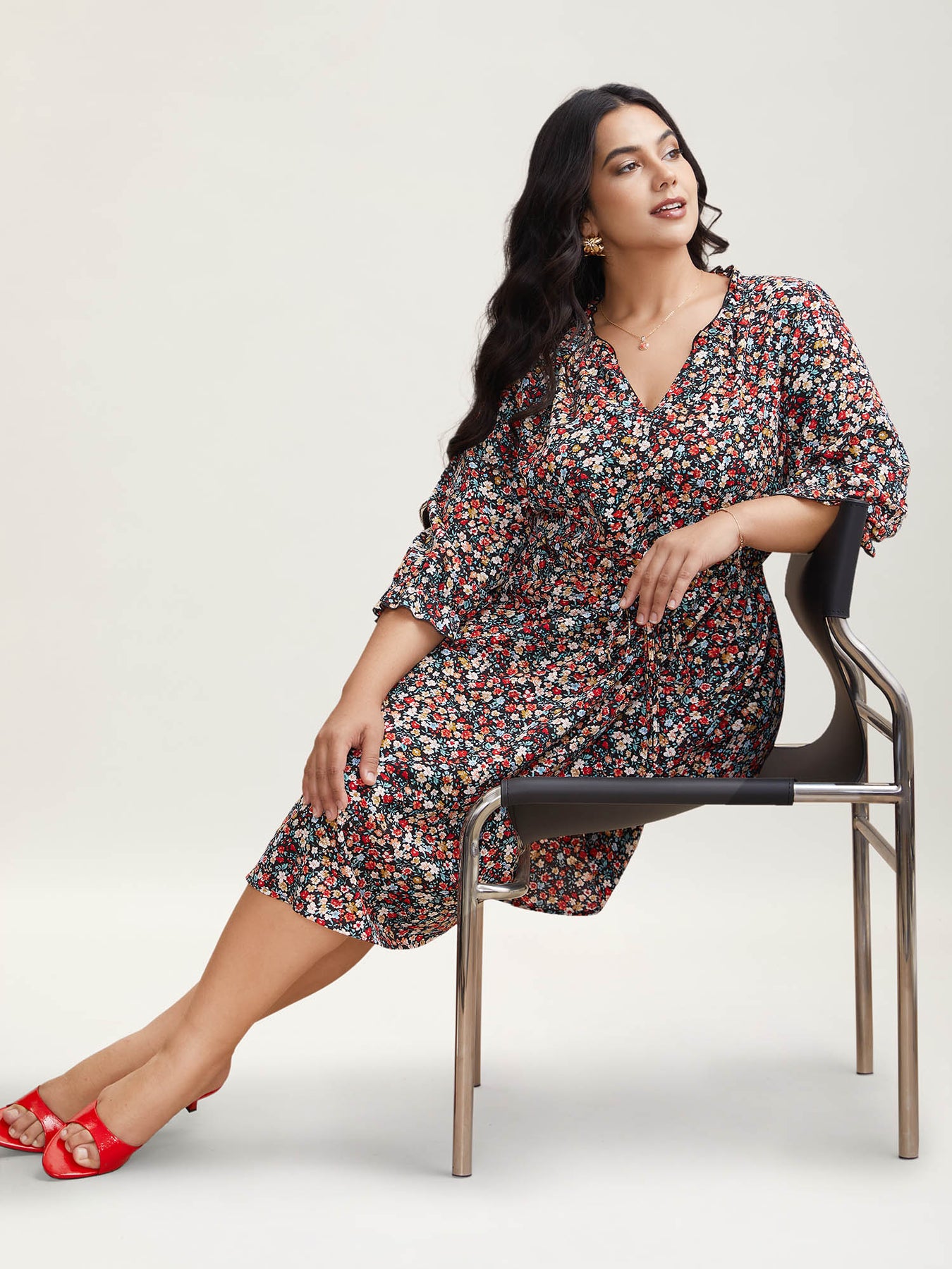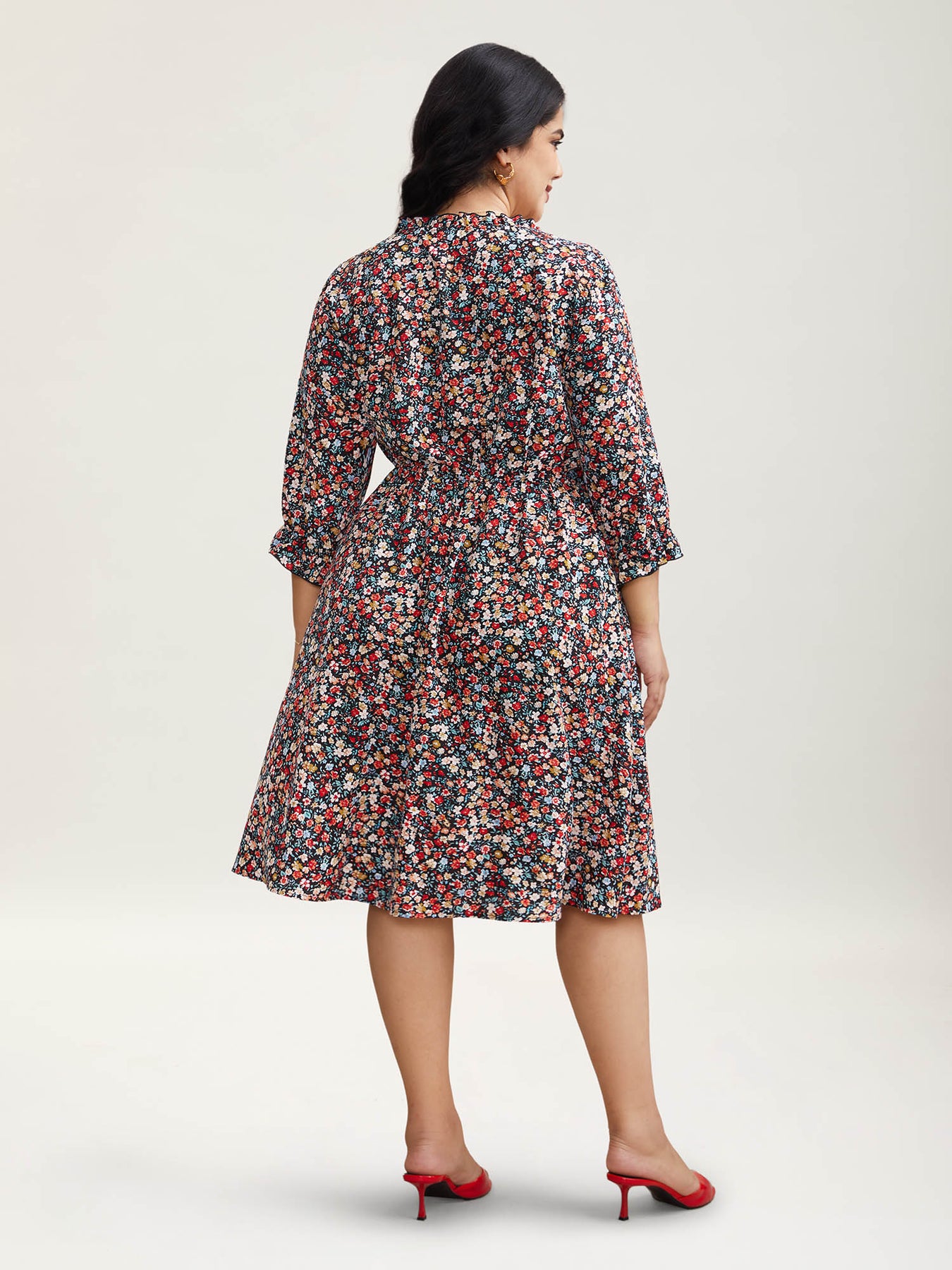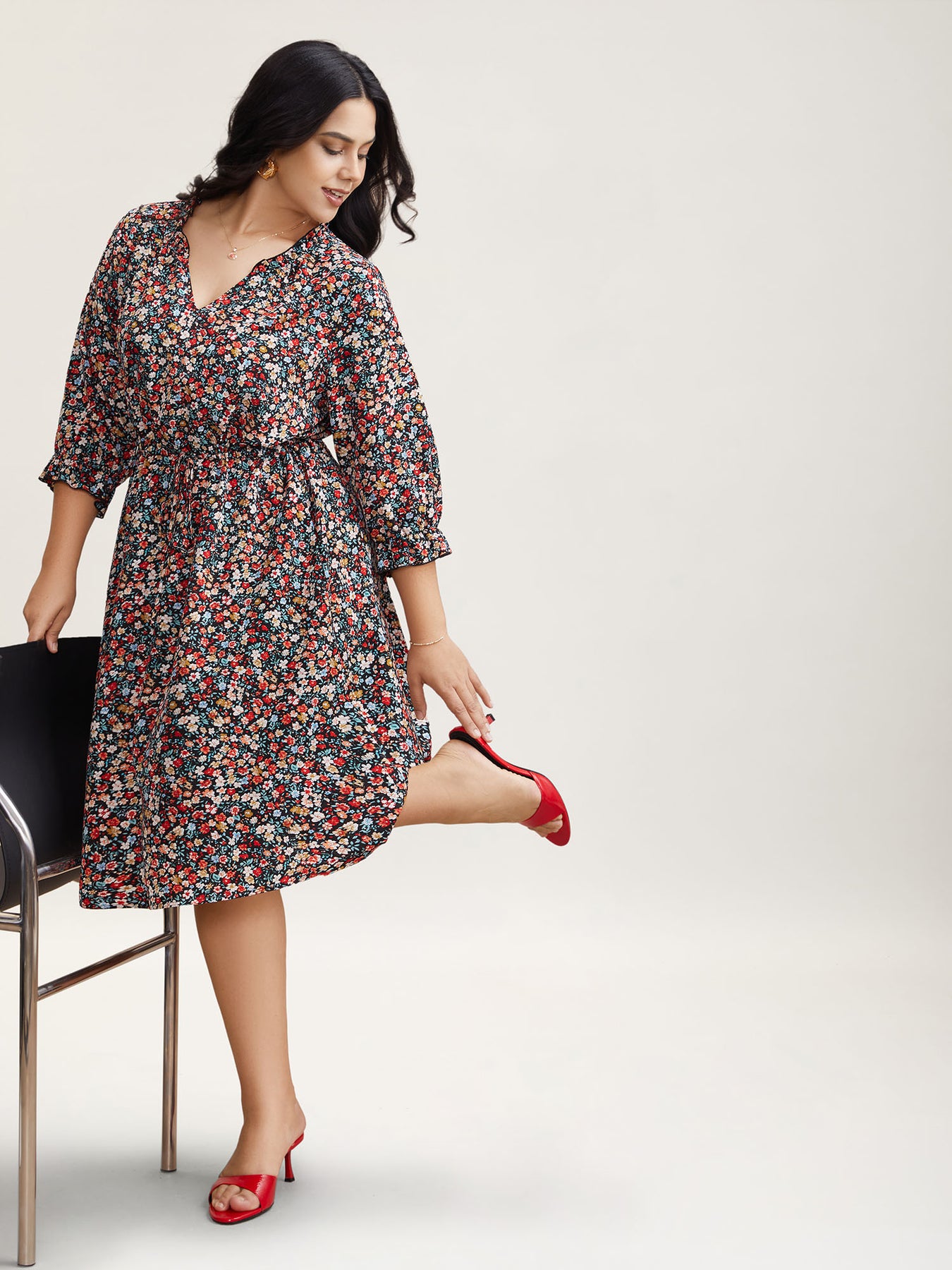 Floral Print Drawstring Pockets Flared Midi Dress